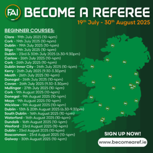 During July & August the FAI are running 25 in-person Referee courses in regions across the Country from July 19 to August 30. If you or anyone you know would like to become a Referee, please visit www.becomearef.ie or apply through the COMET App